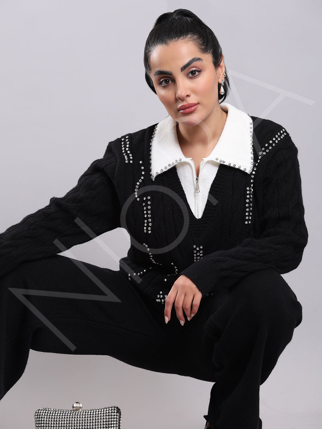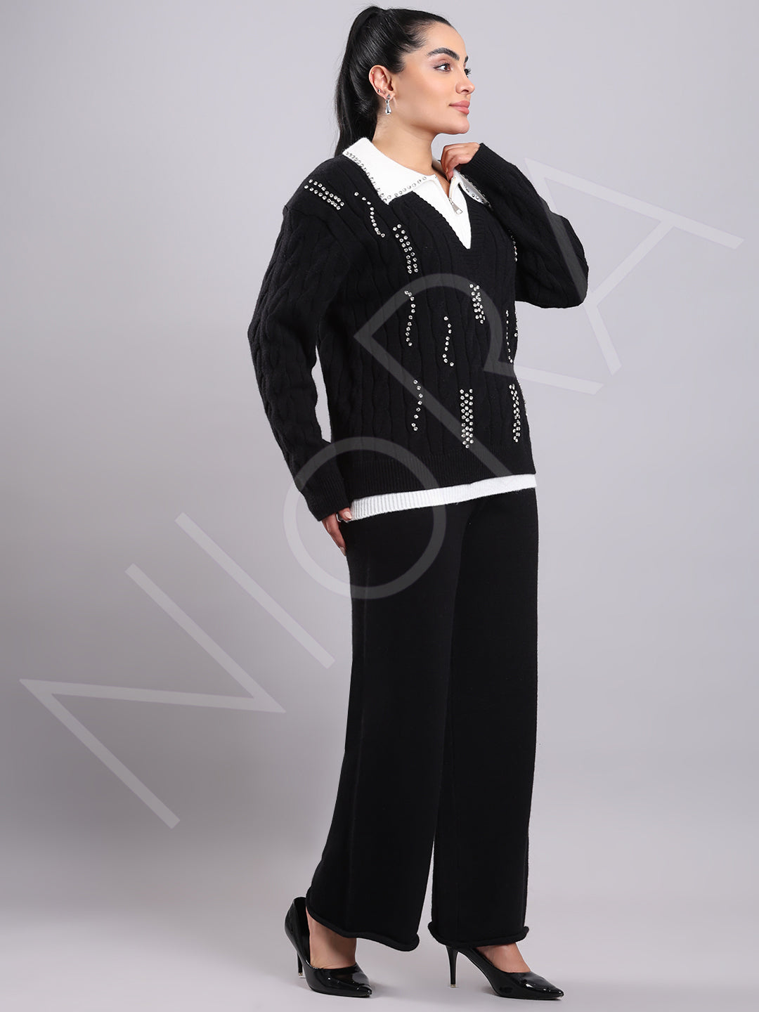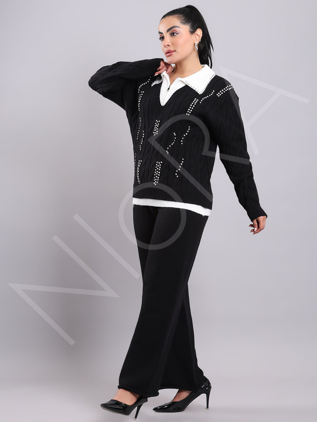 Shine effortlessly in this 2-Piece Embellished Elegance Coord Set, designed for polished winter styling. The upper features a braid-style knit... Read more