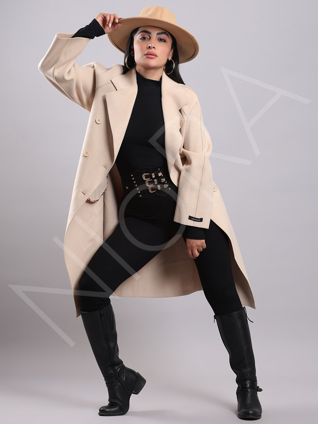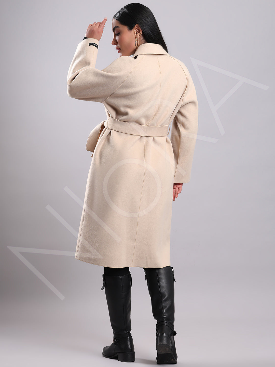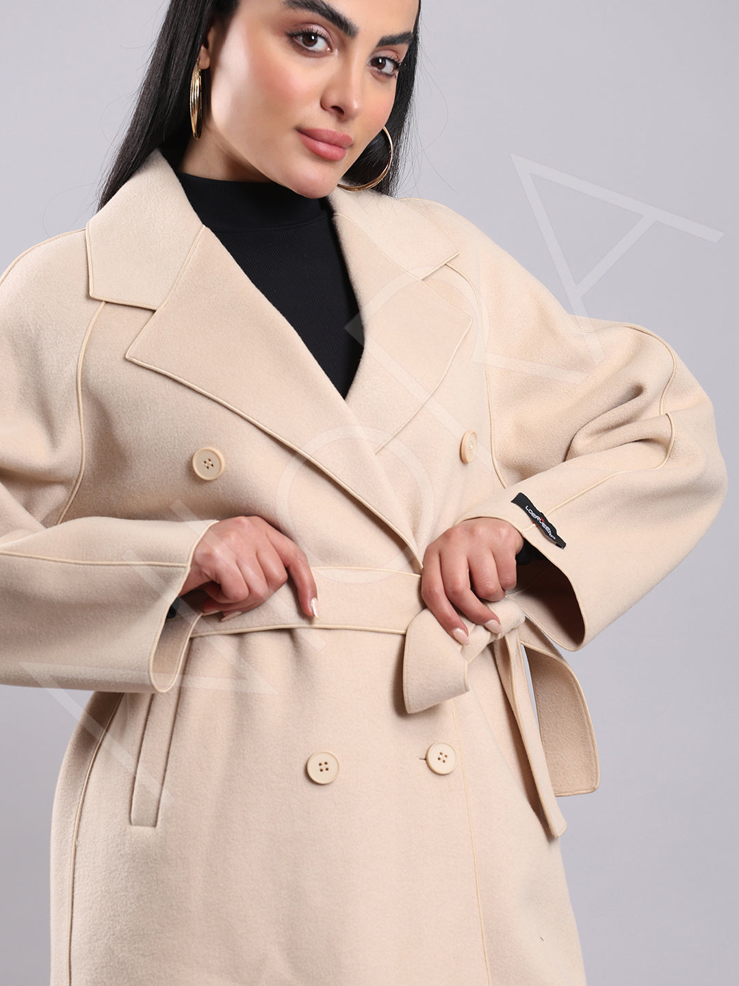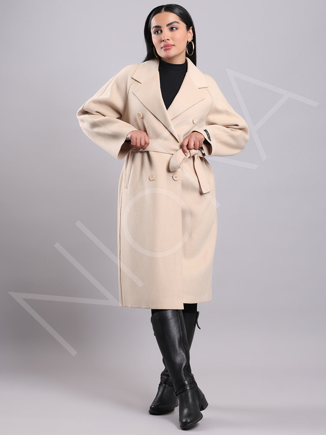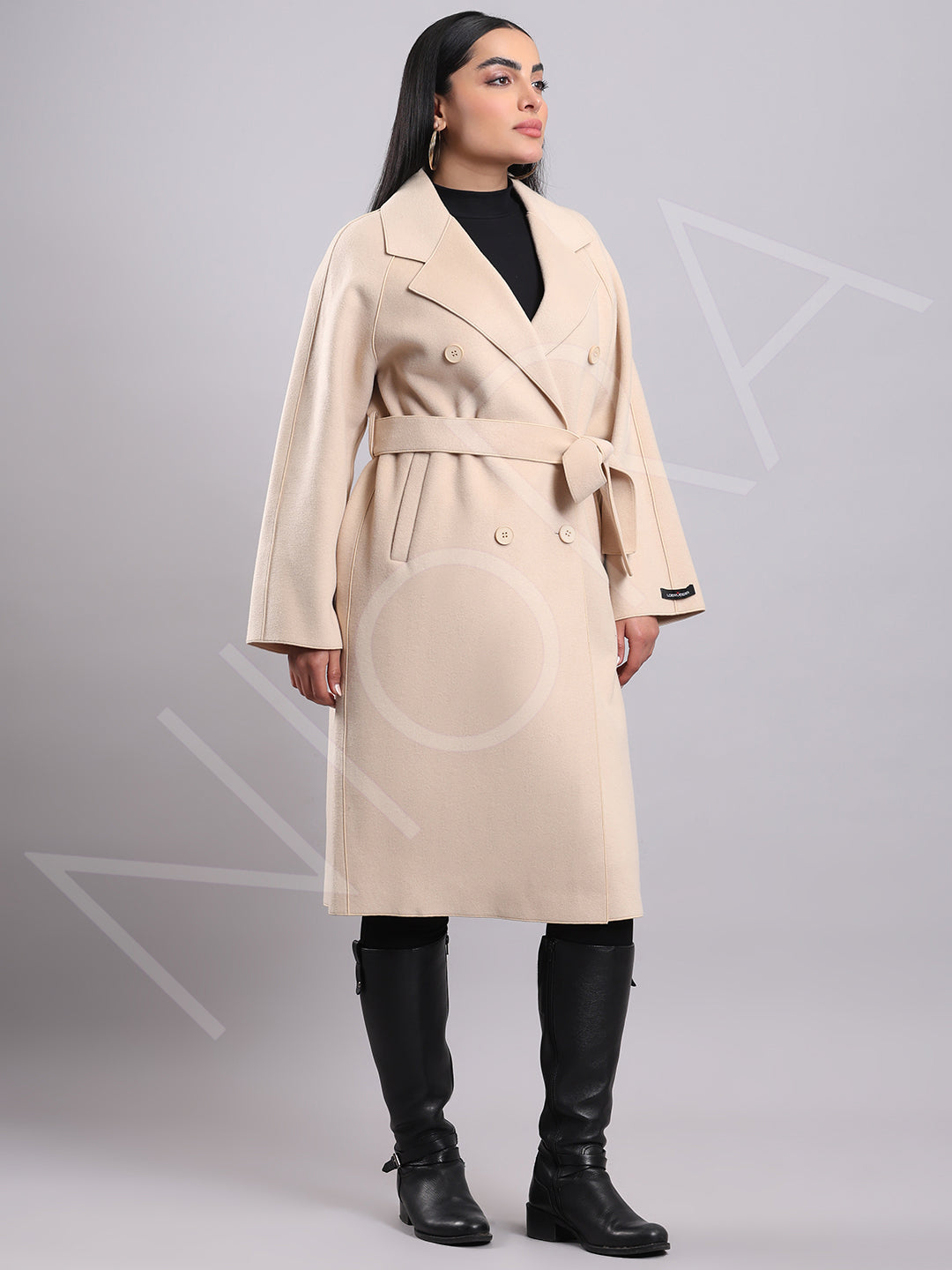This elegant winter coat features a classic notched lapel collar and a double-breasted button closure for a sharp, structured look. Two front patch pockets add practicality, while the detachable tie-able waist belt lets you style it fitted or relaxed. Designed with full sleeves and a below-knee length, it's crafted from soft, structured non-stretchable fabric — perfect for timeless winter elegance.
